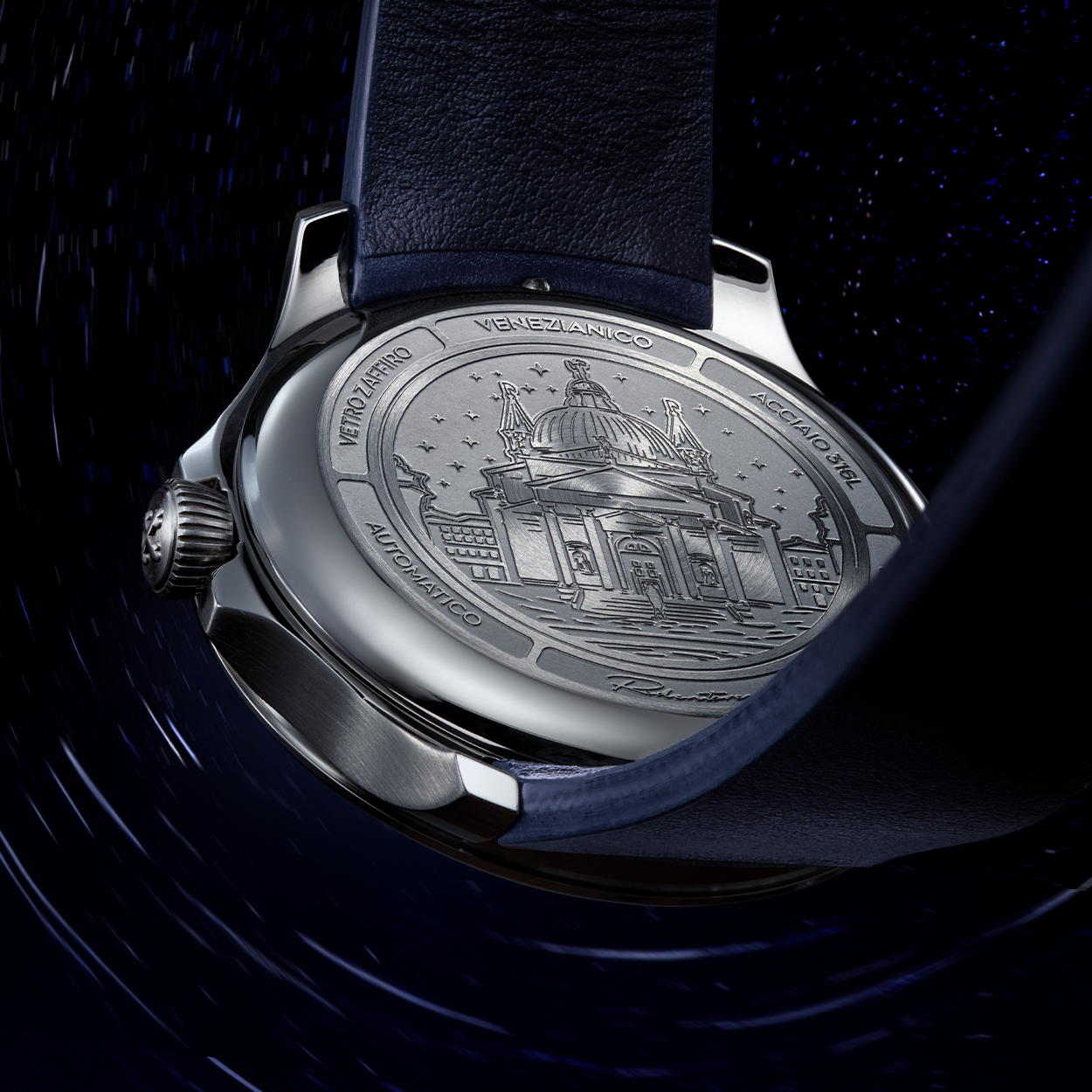 Aventurine, used in this Redentore model, is a fine glass material discovered in Venice in the 17th century by the artisans of Murano. It’s known for its characteristic sparkle, reminiscent of a starry sky, achieved by adding tiny copper fragments during the production process. A detail that makes each dial unique, inspired by Venetian tradition.